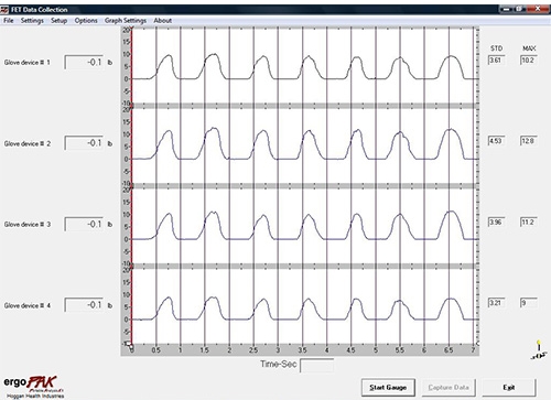 6. The FDC FET data collection software included with ergoGLOVE captures raw data from the sensor(s), while displaying a real-time graph of the data.