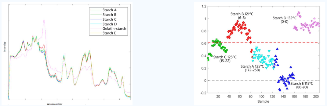 Left: Comparison of the average per processed Raman spectrum of the different recipes used.