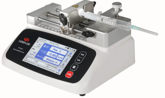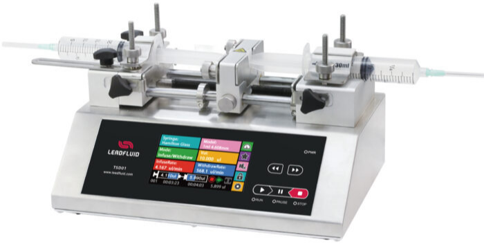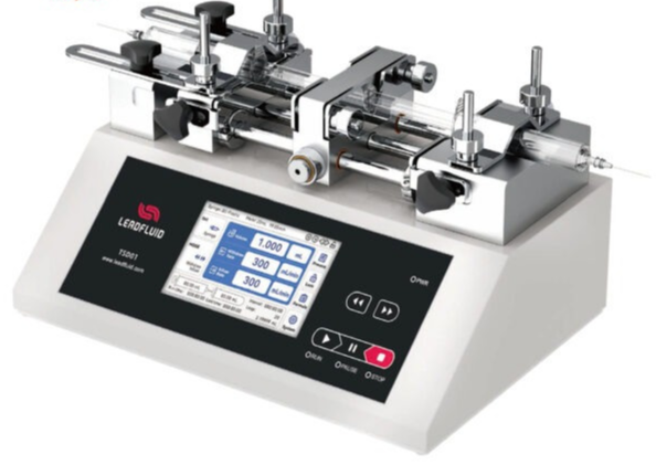 TSD01-01 Two Way Push Pull Syringe Pump TSD01-01 can accommodate two syringes and achieve continuous liquid transfer through external valve control. Featuring a 5-inch high-resolution color LCD display, it offers convenient touchscreen operation for quick parameter setup. Dual-color indicator lights clearly display the current operating status. With built-in support for various syringe manufacturers and specifications, it allows for easy selection and storage of multiple sets of data to meet the requirements of different experimental flow rates. It supports high-precision control, includes protective structures, and features overload alarm mechanisms. The product supports external signal-controlled start/stop, includes built-in RS485 communication, and supports the Modbus protocol. Encased in a metal shell with wide-range power input, it is suitable for various experimental environments. Typical applications: various laboratory applications, micro-volume transfer, micro-flow transfer, pulseless transfer, and high-precision transfer. Flow: 0.184nL/min-83.318mL/min |
