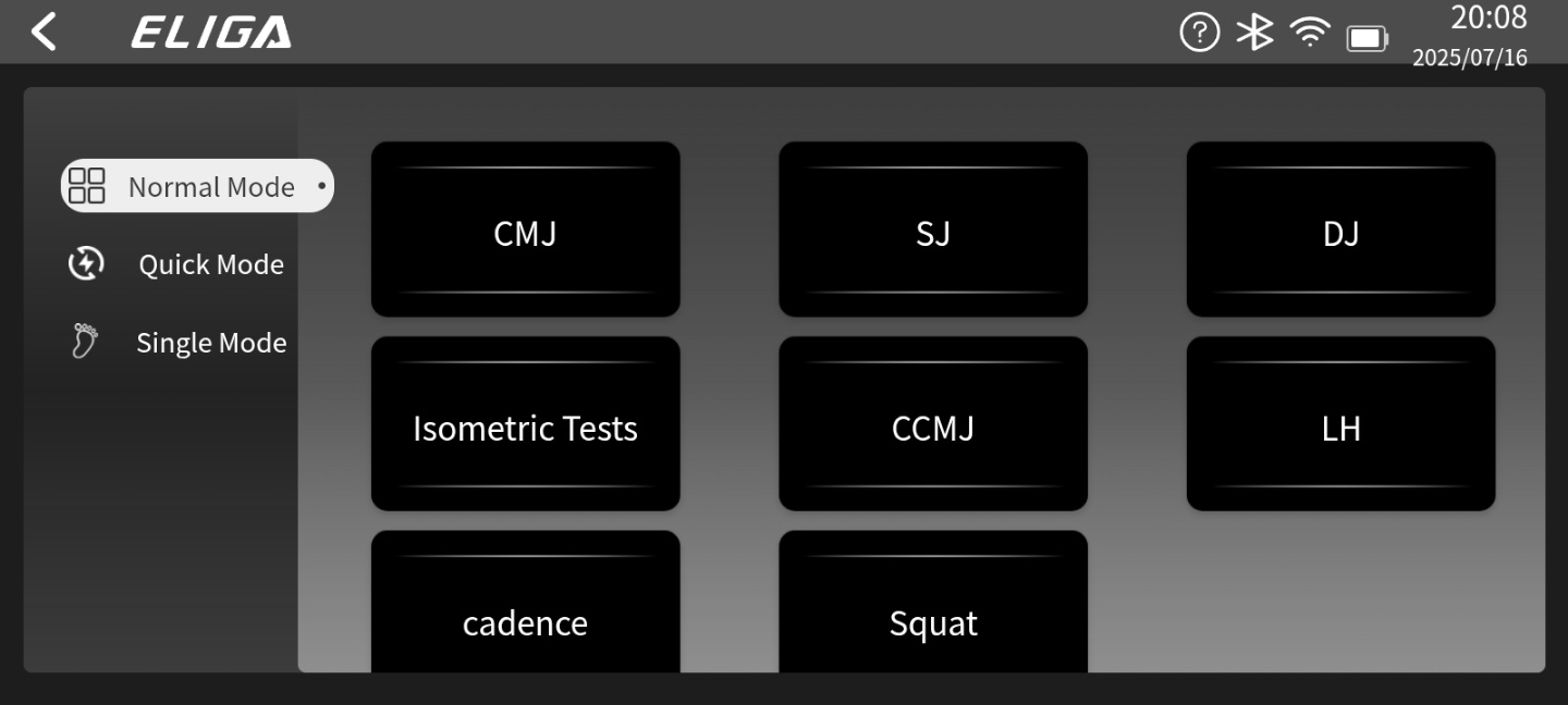 Countermovement Jump (CMJ), Squat Jump (SJ), Drop Jump (DJ), Isometric Mid-Thigh Pull (IMTP) and Consecutive Countermovement Jump (CCMJ) and Free test, can also perform a single-leg test.