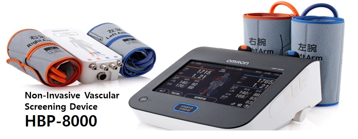[HBP-8000]동맥경화 검사 및 혈관나이/혈관경화도 평가 시스템, HBP8000 비침습적인 동맥경화도 검사 시스템 HBP-8000 (Non-invasive Vascular Screening Device) 동맥경화 진행시 나타나는 신체 질환 - 뇌경색 - 심근경색 - 신장질환 - 폐색성 동맥경화증 HBP-8000 시스템 특장점 양팔 좌,우 혈압 측정(BP) ▷ 양팔 좌,우 혈압계로 사용 가능 ▷ 좌,우 혈압의 차이는 심혈관 질환의 조기 증상 ※ 양팔 혈압의 차이로 심혈관 위험도 평가 가능 혈관 협착도 평가(ABI) ▷ 혈관 건강도 정밀 분석, 동맥 협착도 분석 혈관 나이 / 혈관 경화도 평가(PWV) ▷ 동맥경화 진행정도 확인 ▷ ABI, baPWV, 맥파정보를 바탕으로 분석 1) 연령에따라 baPWV..